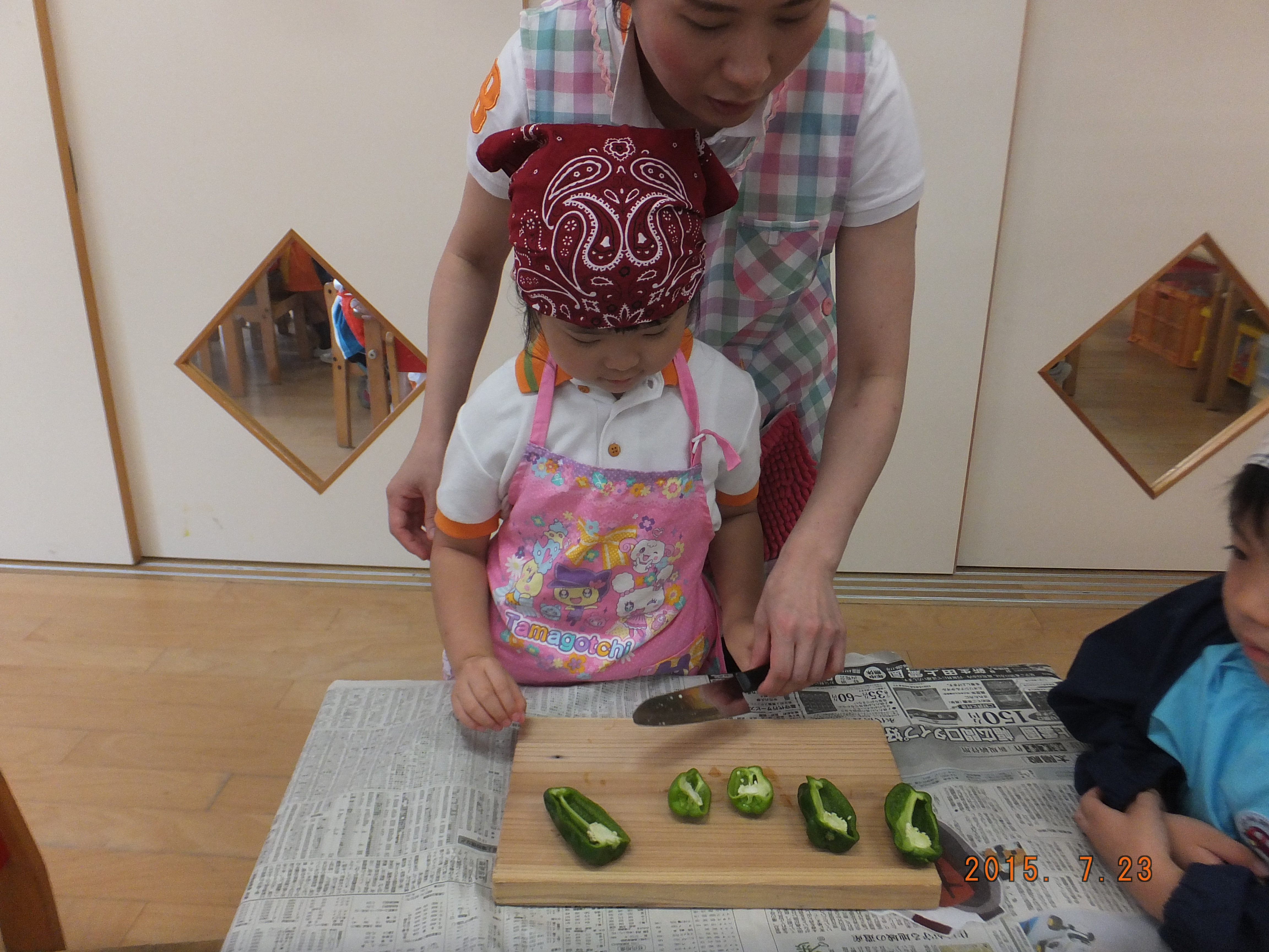 今まで育ててきた野菜を収穫し、洗って、切っての❛焼きそばクッキング!❜エプロンと三角巾をつけて小さなコックさん達は大張り切り、みんなで力をあわせて美味しい焼きそばが出来上がりました♪