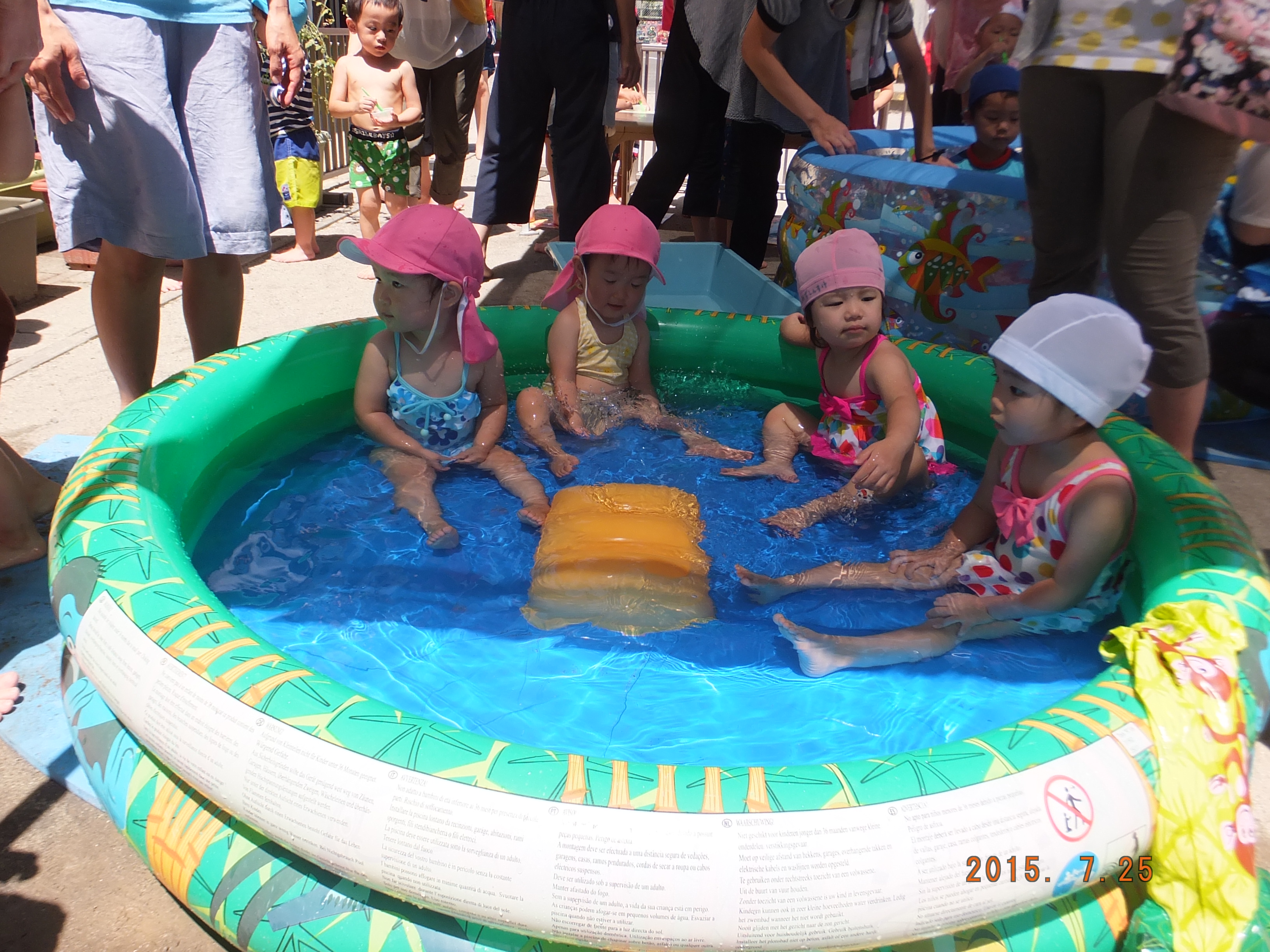 途中の休憩ではデッキに座ってアイスを食べながら「つめた~い」「おいしいね~」と一休み。その後プールに入って体についた絵の具を落としました。「おふろみたいだね~」とはしゃぐ声が聞こえてきました。